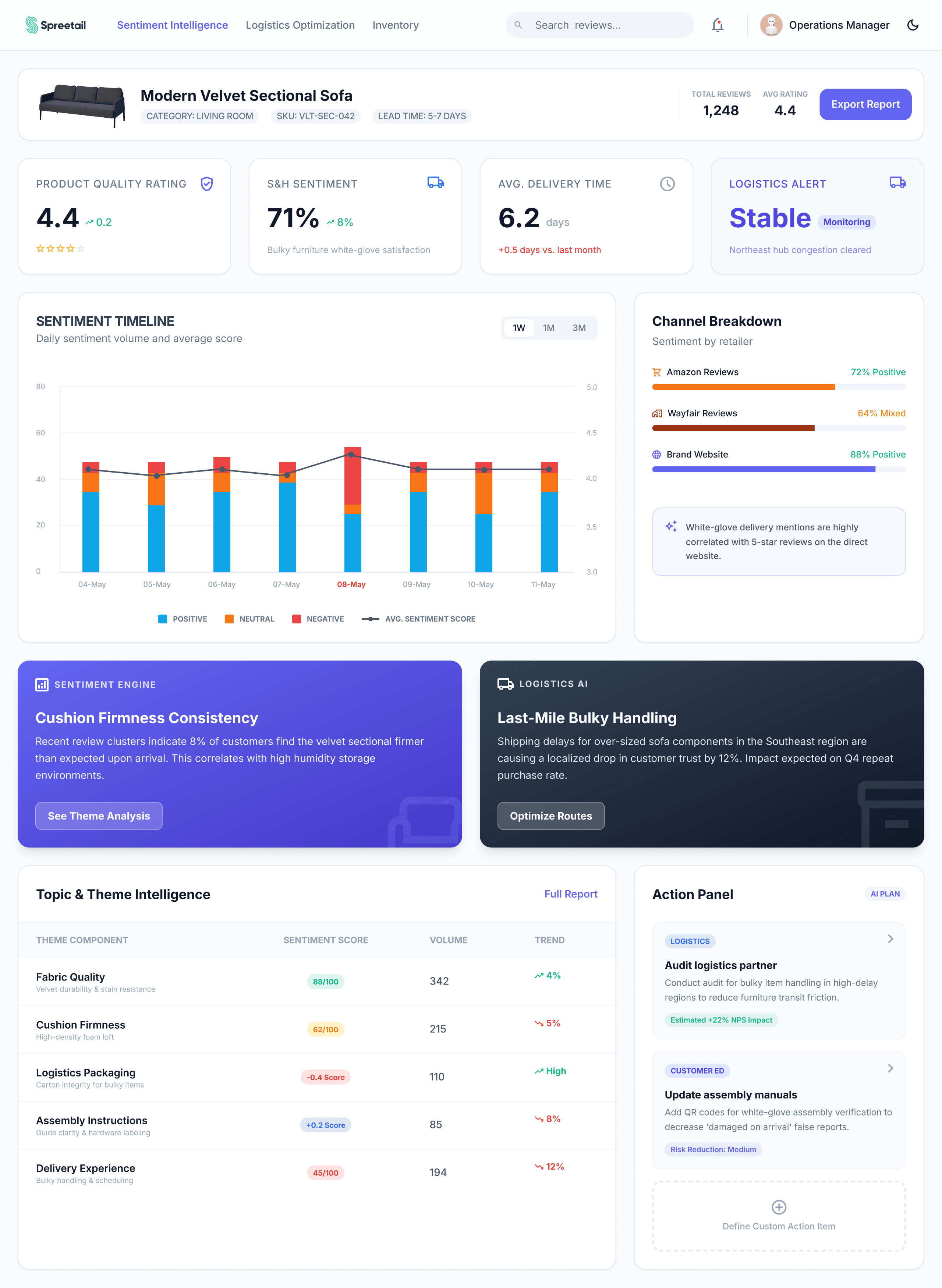 From rising complaints about pricing to emerging praise around onboarding, every insight comes with recommended actions and priority levels.